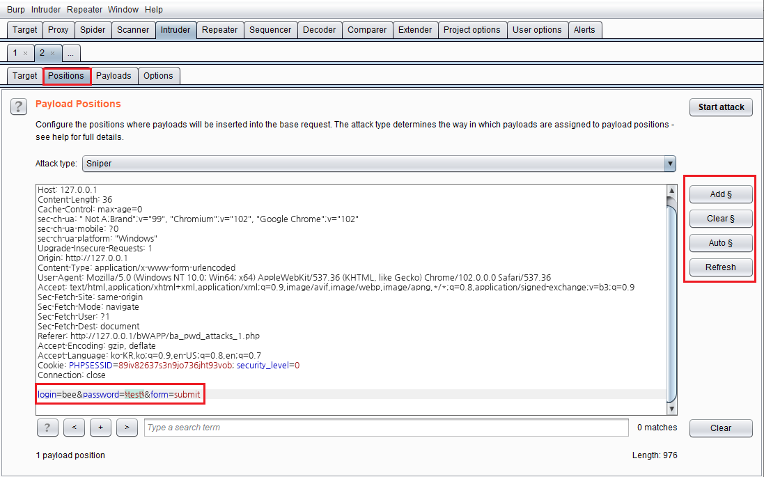 Intruder탭의 하위 탭인 'Positions'으로 이동하면 Payload가 들어갈 위치를 '§' 문자로 지정하여 줍니다. Payload로 들어갈 위치를 지정하여 줄 때는 'password' 변수에만 Payload를 실을 수 있도록 'Add §'와 'Clear §'를 사용하여 Payload의 위치를 변경하여 줍니다.