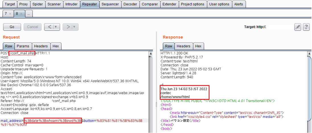 해당 취약한 버전의 제품 웹 서버의 테스트 메일 보내기 콘솔에서 입력 값의 잘못된 유효성 검사로 인해 OS 명령 주입이 가능한 것을 알수 있습니다.