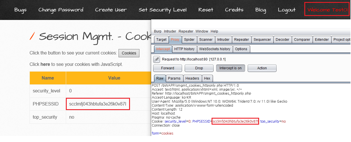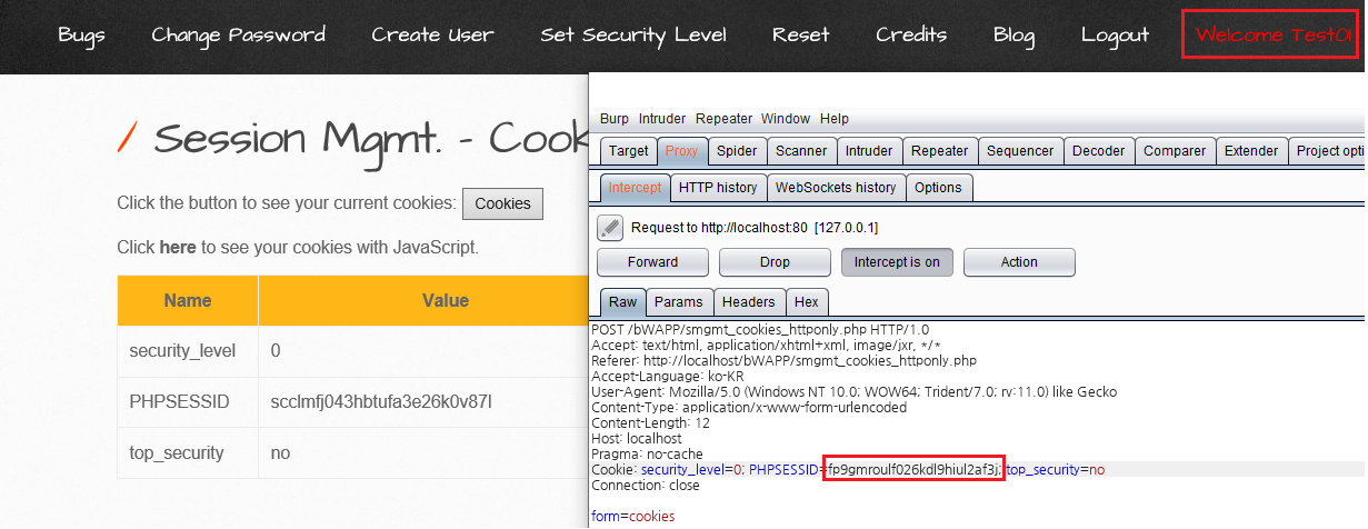 Test01 계정에서 버프스위트를 통하여 패킷을 잡은 후 Cookie 부분을 bee(관리자 계정)의 쿠키 값으로 변경하여 주신 후 Forward 버튼을 눌러 줍니다.