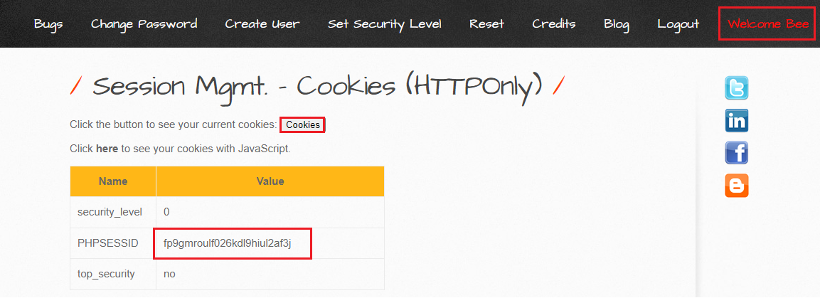 크롬 브라우저를 통하여 bee 계정으로 로그인한 화면으로, 로그인 후 Cookies 버튼을 눌러 쿠키 정보를 확인하였습니다. here 글씨를 누르면 팝업창으로도 쿠키 정보를 확인할 수 있습니다.
