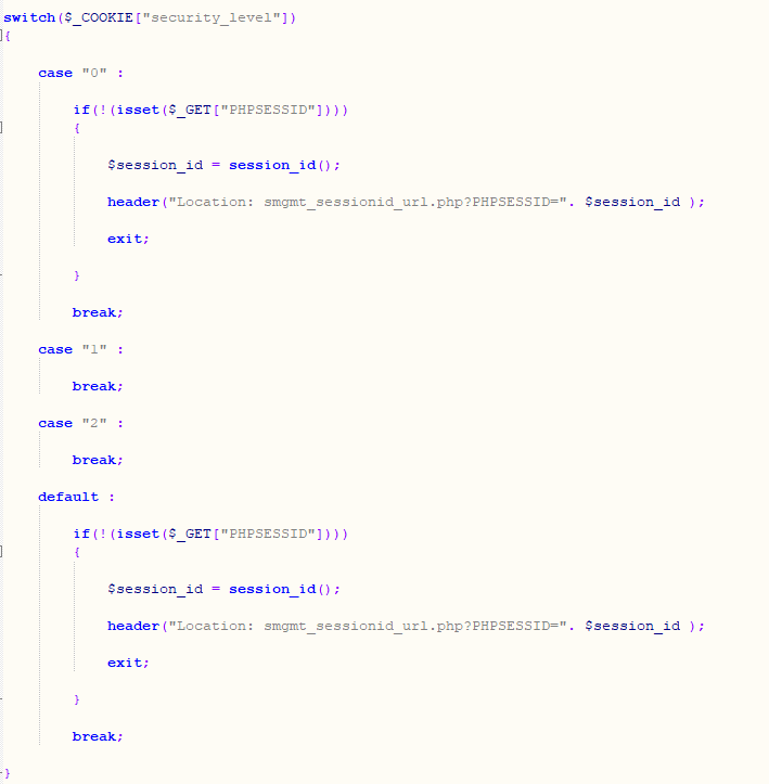 smgmt_sessionid_url.php 페이지의 소스 코드를 확인해 보면 난이도 하에서는 PHP의 'header' 함수를 사용하여 HTTP 헤더를 서버로 보냅니다. header 함수에 사용된 'Location'은 콜론 뒤에 있는 주소로 리다이렉션 하는 헤더 메시지로 세션 ID를 URL에 노출이 되게 코드가 작성되어 있는 것을 알 수 있습니다.
