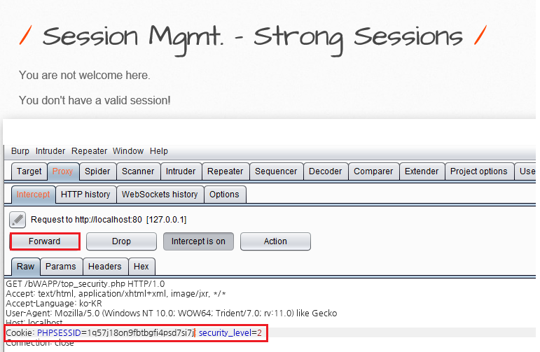 'top_security.php' 페이지에서 확인한 Cookie 값의 세션 ID 값을 Bee계정의 세션 ID 값으로 수정한 후 Forward 버튼을 눌러 줍니다.