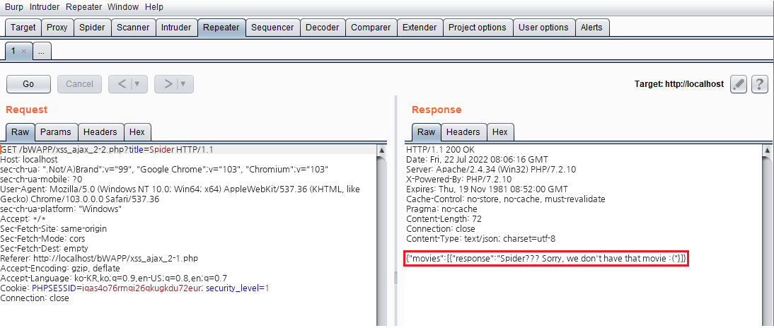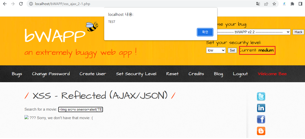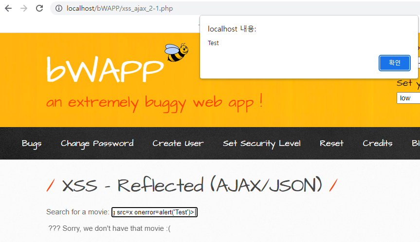 비박스(bWAPP) A3 XSS - Reflected (AJAX/JSON)