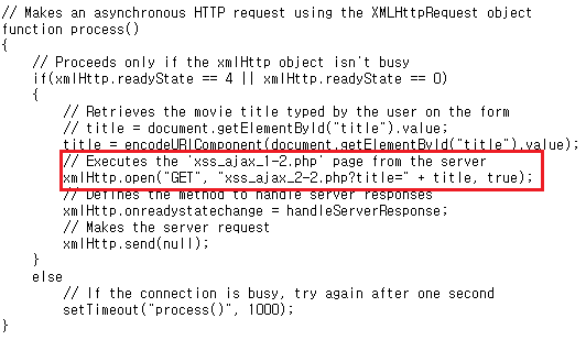 xss_ajax_2-1.php 페이지의 소스코드를 확인해 보면 위와 같이 입력값을 GET 방식으로 xss_ajax_2-2.php 에 보내는 것을 확인할 수 있습니다.