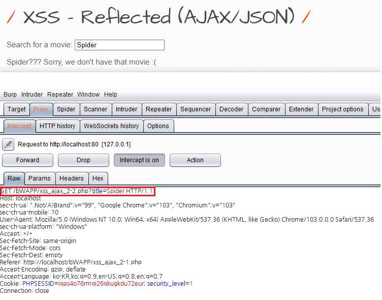 Burp Suite를 실행하고 xss_ajax_2-1.php 페이지에서 값을 입력 후 요청 패킷을 가로챈후 헤더를 확인해 보면 xss_ajax_2-1.php 페이지에서 입력한 값이 xss_ajax_2-2.php 페이지의 title 변수에 저장이 되는것을 알수 있습니다.