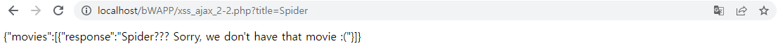 xss_ajax_2-2.php 페이지의 title 변수에 값을 입력후 웹 페이지를 접속해보면 JSON 형식으로 입력한 값이 출력되는 것을 확인할 수 있으며, xss_ajax_2-1.php 페이지에서 문자열을 출력하는 스크립트 코드를 입력하거나 웹 페이지에서 검색하면 xss_ajax_2-2.php 페이지로 값이 전달되므로 xss_ajax_2-1.php 페이지에서는 스크립트 실행을 확인 할수 없습니다.