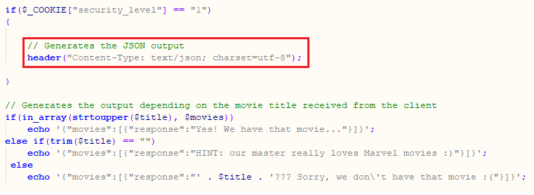 xss_ajax_2-2.php 페이지의 소스코드를 확인해 보면 난이도 중에서는 header() 함수를 통해 Content-Type을 json으로 보내고 있었고, 이를 통해 자바스크립트 코드의 실행을 차단할 수 있었습니다.