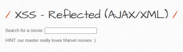 해당 페이지를 확인해 보면 XSS - Reflected (AJAX/JSON) 페이지와 마찬가지로 AJAX 기능을 활용하여 검색어를 입력하면 해당하는 영화가 데이터베이스에 있는지를 확인하고 결과를 바로 출력하는 것을 확인할 수 있습니다.