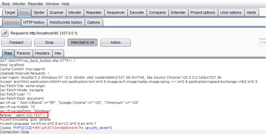 버프 스위트로 패킷을 잡아 Referer 헤더에 ';alert('XSS TEST')'; 값을 입력해 주었습니다.