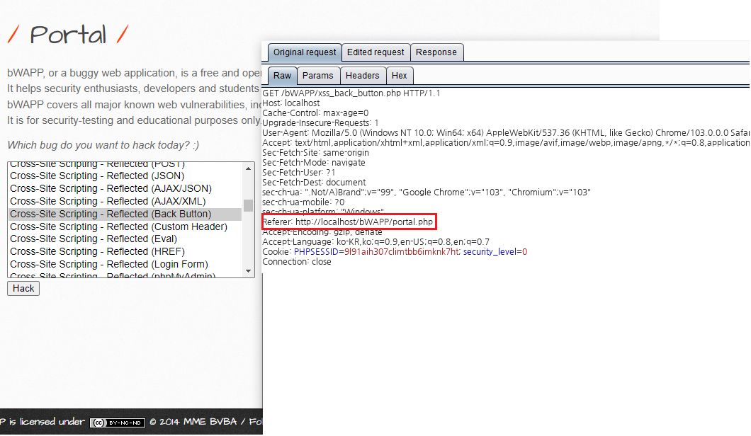 - [hxxp://localhost/bWAPP/portal.php] 웹페이지에서 Cross-Site Scripting - Reflected (Back Button) 클릭하여 [hxxp://localhost/bWAPP/xss_back_button.php] 페이지로 이동했을 때 Referer는 [hxxp://localhost/bWAPP/portal.php] 가됩니다.
