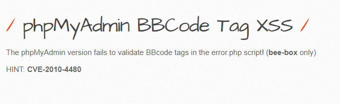 'xss_phpmyadmin.php' 페이지를 확인해 보면 phpMyAdmin 버전은 error.php 스크립트에서 BBcode 태그의 유효성을 검사하지 못합니다!라는 메시지를 확인할 수 있고 힌트에는 CVE-2010-4480이라고 명시되어 있습니다.