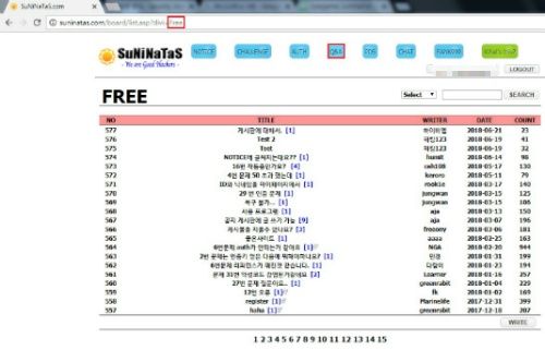 그럼 Q&A 탭에가서 URL 을 확인해 보시면 http://suninatas.com/board/list.asp?divi=Free 이렇게 나오실겁니다. 여기서 divi=notice 이렇게 바까보면 notice 페이지로 가는것을 알수 있습니다.