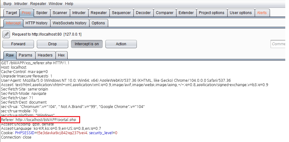 프록시 툴을 이용하여 portal.php 페이지에서 xss_referer.php 페이지로 넘어갈 때 패킷을 잡아 줍니다.