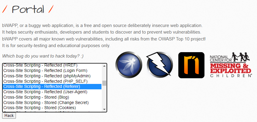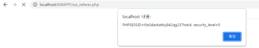 [hxxp://localhost/bWAPP/portal.php] 웹페이지에서 Cross-Site Scripting - Reflected (Referer) 클릭하여 [hxxp://localhost/bWAPP/xss_referer.php] 페이지로 이동했을 때 Referer는 [hxxp://localhost/bWAPP/portal.php] 가됩니다.