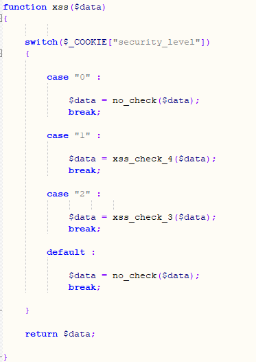난이도 중에서는 xss_check_4 함수를 사용하는 것을 알 수 있으며 xss_check_4 함수는 functions_external.php에 정의되어 있고 addslashes() 함수를 이용하여 입력 데이터를 우회합니다. addslashes() 함수는 데이터베이스 쿼리에서 필드 값으로 저장하기 전에 사용되는 함수입니다. 만일 문자열에 작은따옴표('), 큰따옴표("), 백 슬래시(\), NULL 문자(%00)가 포함되어 있다면, 이 문자들 앞에 백 슬래시(\)를 붙여 특수 문자가 순수한 하나의 문자로 인식되도록 해줍니다.