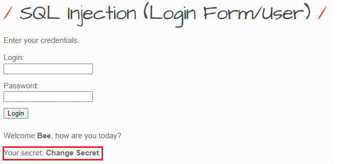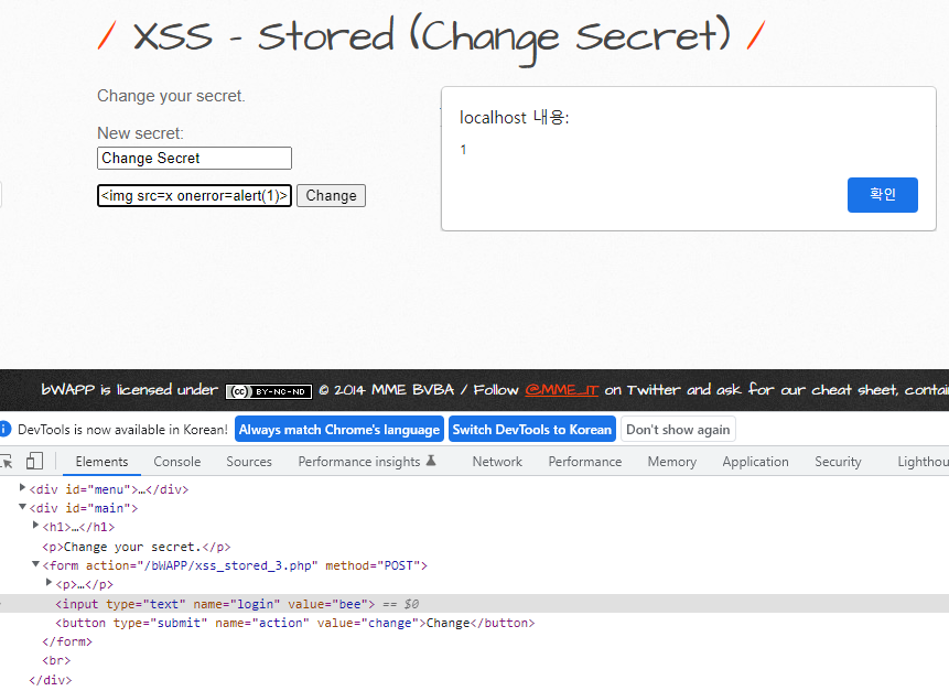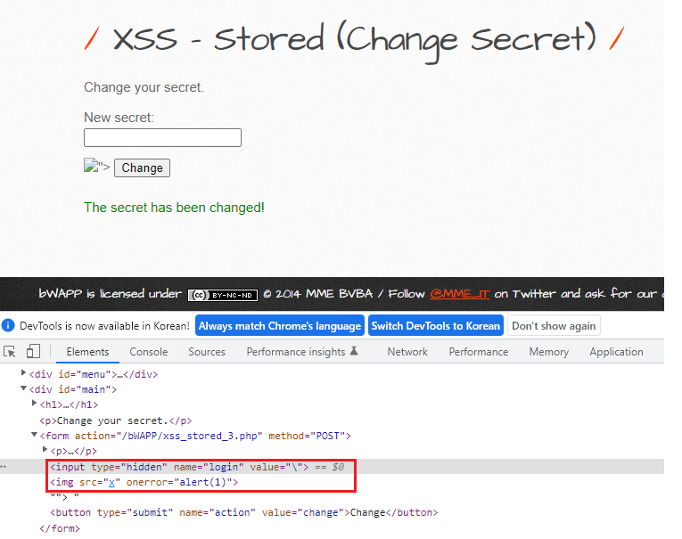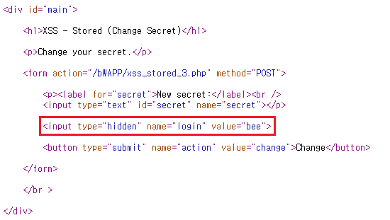 비박스(bWAPP) A3 XSS - Stored (Change Secret)