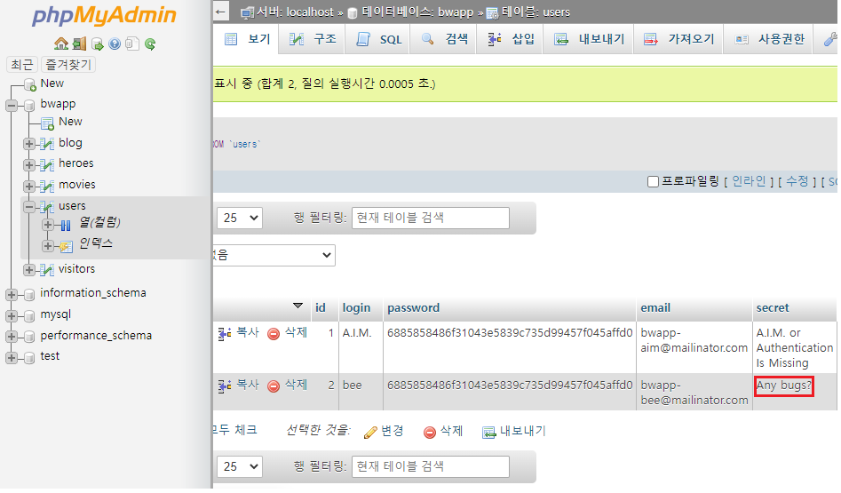 phpMyAdmin 페이지에 로그인을 한뒤 users 테이블에서도 확인이 가능합니다. 그럼 다시 xss_stored_3.php 페이지에서 비밀번호 힌트를 바꿔 보도록 하겠습니다.