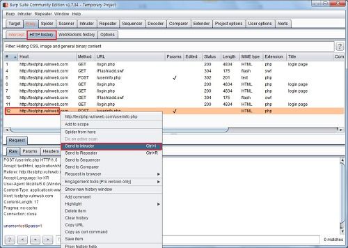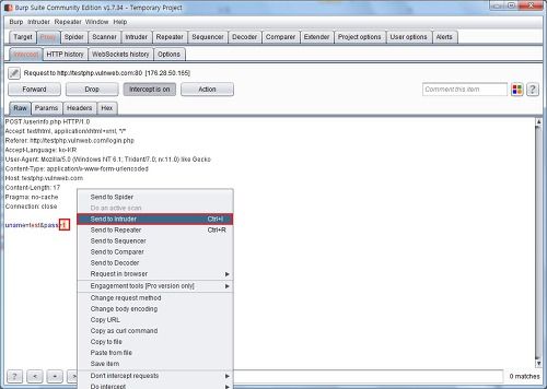 첫번째 방법은 패킷을 잡으신후 Raw탭에서 마우스 오른쪽 버튼 클릭후 Send to Intruder 하는 방법과