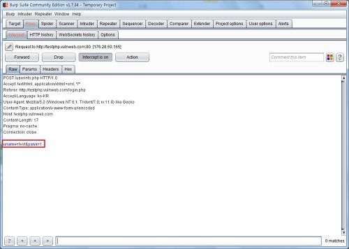 해당 화면은 프록시를 잡은 모습입니다. Intercetp 탭에 Raw를 보시면 Username / Password 를 넣은 패킷이 잡히시는걸 확인하실 수 있습니다.