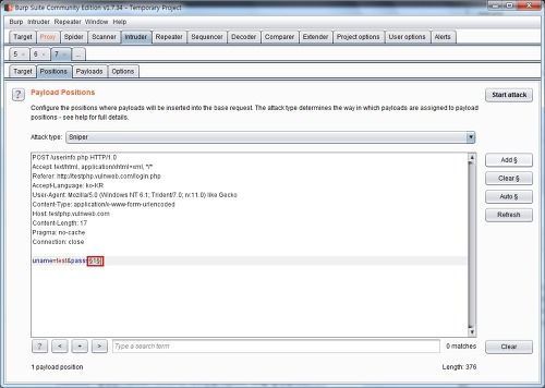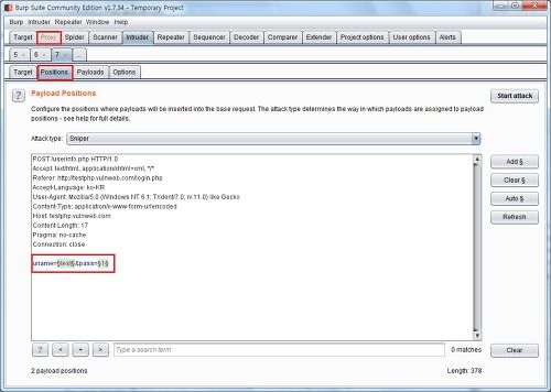Position 탭에보시면 uname=§test§&pass=§1§ 보이시는데 § 문자로 둘러 쌓여 있는 부분이 페이로드로 설정된 항목 입니다.