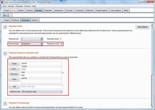 여기서는 Simple list type 을 사용하도록 하겠습니다. 그림과 같이 txt 파일을 만들어서 Load를 하셔도 되고 입력후 Add를 누르셔도 됩니다. 단 여기서 테스트할 패스워드 test 는 꼭 삽입하시기 바랍니다. 삽입을 하셨다면 Start attack 버튼을 눌러 보도록 하겠습니다.