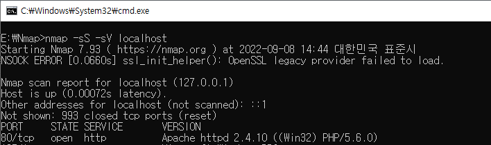 sm_dos_1.php 페이지를 살펴보면 Apache 웹 서버는 느린 HTTP DoS 공격에 취약합니다! 라는 메시지를 확인할 수 있습니다. NMAP을 통하여 Apache 서비스가 오픈되어 있는지 확인해 보도록 하겠습니다.