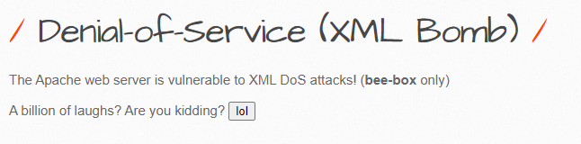 sm_dos_2.php 페이지를 살펴보면 Apache 웹 서버는 XML DoS 공격에 취약합니다! 메시지와 lol 버튼을 확인할 수 있습니다.