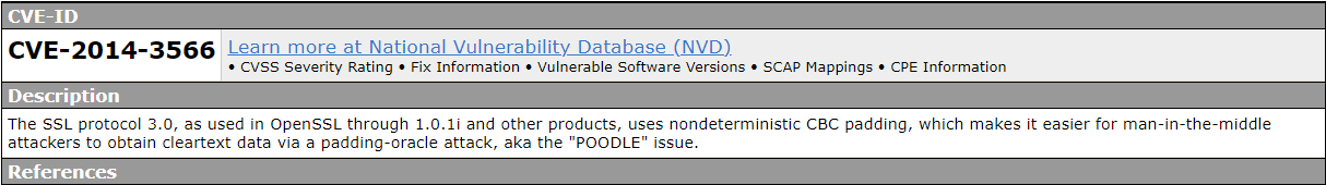 POODLE 공격(Padding Oracle on Downgraded Legacy Encryption)은 SSL 3.0 프로토콜(CVE-2014-3566)의 취약점을 악용합니다. 이 취약점으로 인해 공격자는 SSLv3을 사용하여 암호화된 통신을 도청할 수 있습니다.