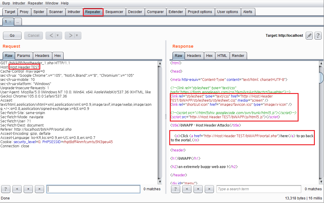 버프 스위트 Repeater 기능을 사용하여 요청 값을 보내고 응답 값을 확인해 보면 버프를 통하여 조작된 Host header 값이 삽입되는 것을 알 수 있습니다. 이미지 파일이나 페이지가 깨진 이유는 HTTP 요청 시 stylesheet.css, html5.js 파일들을 참조하여 페이지를 보여줘야 하지만 그렇지 못하여 페이지가 깨져서 보이는것입니다. 테스트를 해보시는 분든들 조작하기 전 값과 조작 후의 값을 확인해 보시기를 바랍니다.