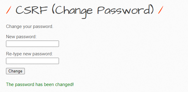 CSRF password Chage를 눌러주면 패스워드 변경 페이지로 이동하고 패스워드가 변경이 되었다는 메시지를 확인할 수 있습니다.
