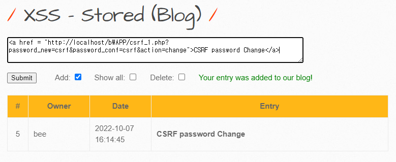 먼저 패스워드를 변경하는 CSRF 공격을 하기 위해서는 비박스에서 A1 HTML Injection - Stored (Blog) 페이지 또는 A3 XSS - Stored (Blog) 페이지를 이용해야 합니다. 여기서는 A3 XSS - Stored (Blog) 페이지를 이용하여 진행해 보도록 하겠습니다.