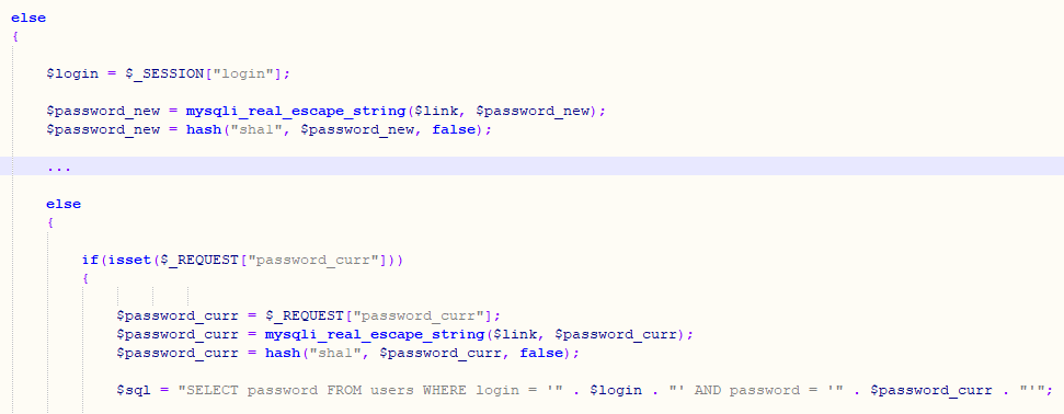 또한 passwor_curr변수의 입력 값을 SHA-1 해시 값으로 변환 후 데이터베이스에 저장된 비밀번호 해시 값과 비교하고 있으며 비밀번호를 변경하기 위해서는 위에서도 언급한 바와 같이 현재 비밀번호가 필요하다는 걸 확인할 수 있습니다.
