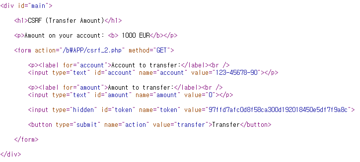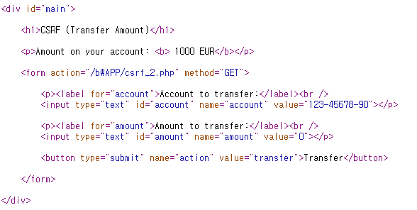 csrf_2.php 페이지는 이체금액을 조작할 수 있는 CSRF 취약점을 제공하고 있습니다.