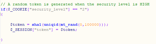 세션 할당을 위하여 mt_rand 함수로 랜덤 값을 반환하고 다시 그 반환 값을 uniqid 함수의 인자로 입력합니다. 그다음 SHA-1 함수로 uniqid의 반환 값을 해시 값으로 생성하여 토큰 값으로 사용하고 있습니다.
