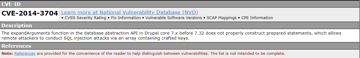 Drupal core 7.x 7.32 이전의 데이터베이스 추상화 API에 있는 expandArguments 함수는 준비된 명령문을 제대로 구성하지 않아 원격 공격자가 조작된 키가 포함된 어레이를 통해 SQL 주입 공격을 수행할 수 있습니다.