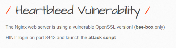 heartbleed.php 페이지를 살펴 보면 Nginx 웹 서버가 취약한 OpenSSL 버전을 사용하고 있습니다.라는 메시지와 공격 스크립트를 확인할수 있습니다.