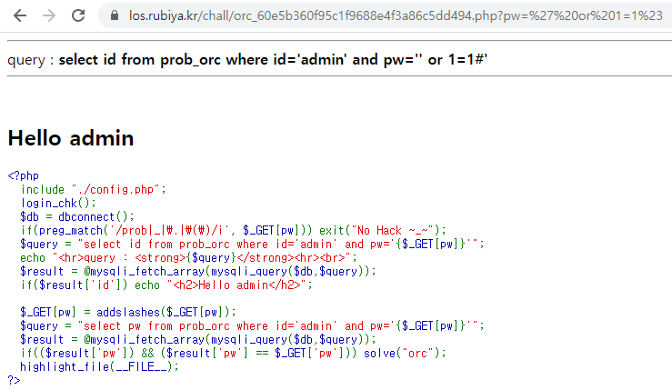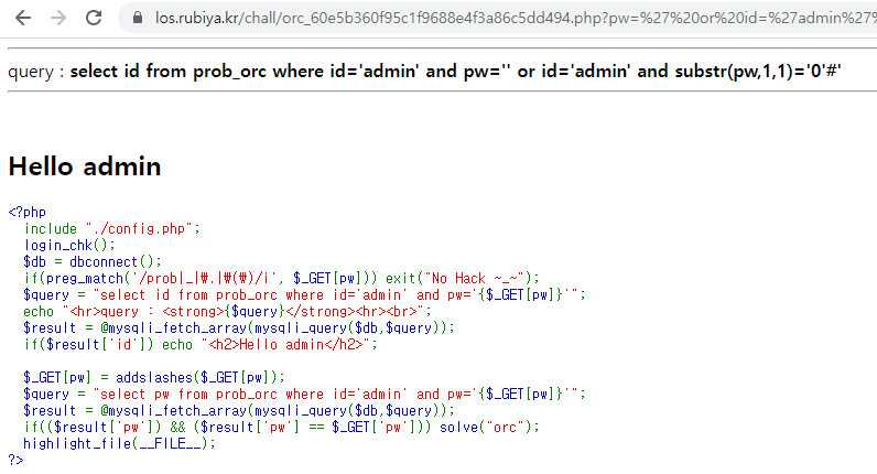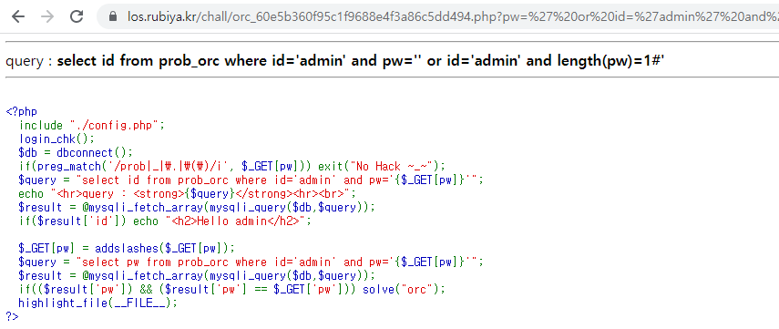 select id from prob_orc where id='admin' and pw='' or id='admin' and length(pw)=1#'