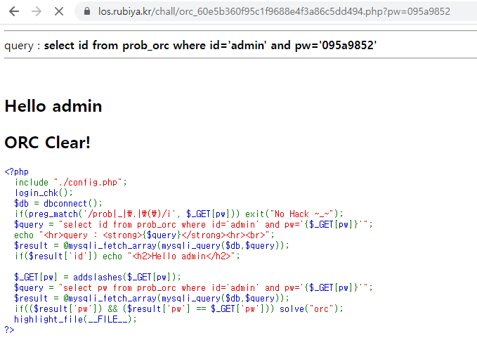 if(($result['pw']) && ($result['pw'] == $_GET['pw'])) solve("orc");
