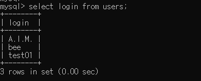 bWAPP DB에서 users 테이블의 login 컬럼을 조회한 결과 값입니다.