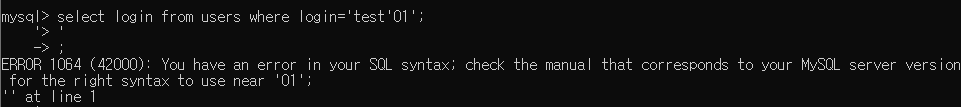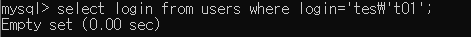 login test'01 값에 백슬래시(\)를 포함시켜 문자열로 처리하였더니 에러표시가 나지 않는것을 확인할 수 있습니다. login 값에 test'01 값이 없으므로 값은 출력되지 않습니다.