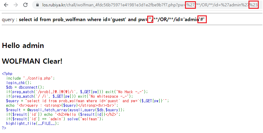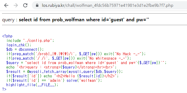 preg_match : porb _ . ( ) 필터링이 되어 있고 i 옵션을 통하여 대소문자를 구분하지 않음 pw='필터링값'이 있을 경우 "No Hack ~_~" 문구를 출력합니다.