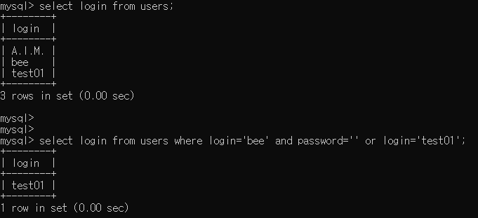 login='bee' and password='' 조건은 패스워드 값이 없기 때문에 그다음의 OR 조건을 통하여 'test01' 값을 출력하게 됩니다.
