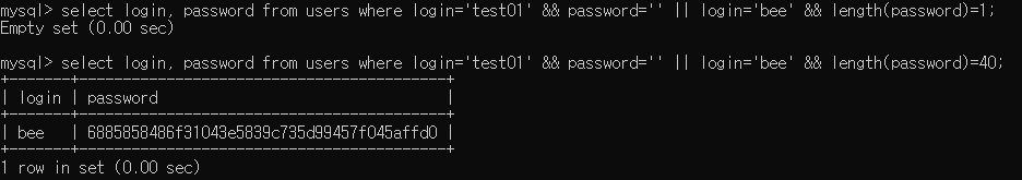 3. length 함수를 이용하여 'bee' 계정의 패스워드 길이 확인
