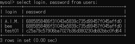 2. 'users' 테이블의 'login', 'password' 컬럼의 정보 확인